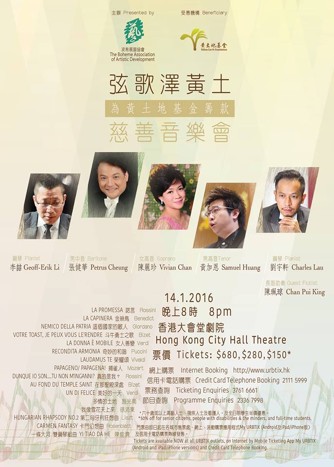 活動與消息 2015 2. 2015年9月甘肅之行 → 1. 「弦歌澤黃土」籌款音樂晚會 「弦歌澤黃土」籌款音樂晚會 由波希展藝協會主辦的「弦歌澤黃土」籌款音樂晚會,即將於2016年1月14日晚,於香港大會堂劇院舉行。 當晚香港大會堂將星光熠熠,樂韻悠揚,節目詳情請見海報。 音樂會收入扣除開支將捐助黃土地基金。門票現已公開發售,欲購從速。 欣賞美樂,同時行善,一樂也! 網上購票:https://ticket.urbtix.hk/internet 活動與消息 2015 2. 2015年9月甘肅之行 → 2019-07-28T22:57:45+08:00 與他人分享這篇文章! FacebookTwitterLinkedInWhatsappEmail