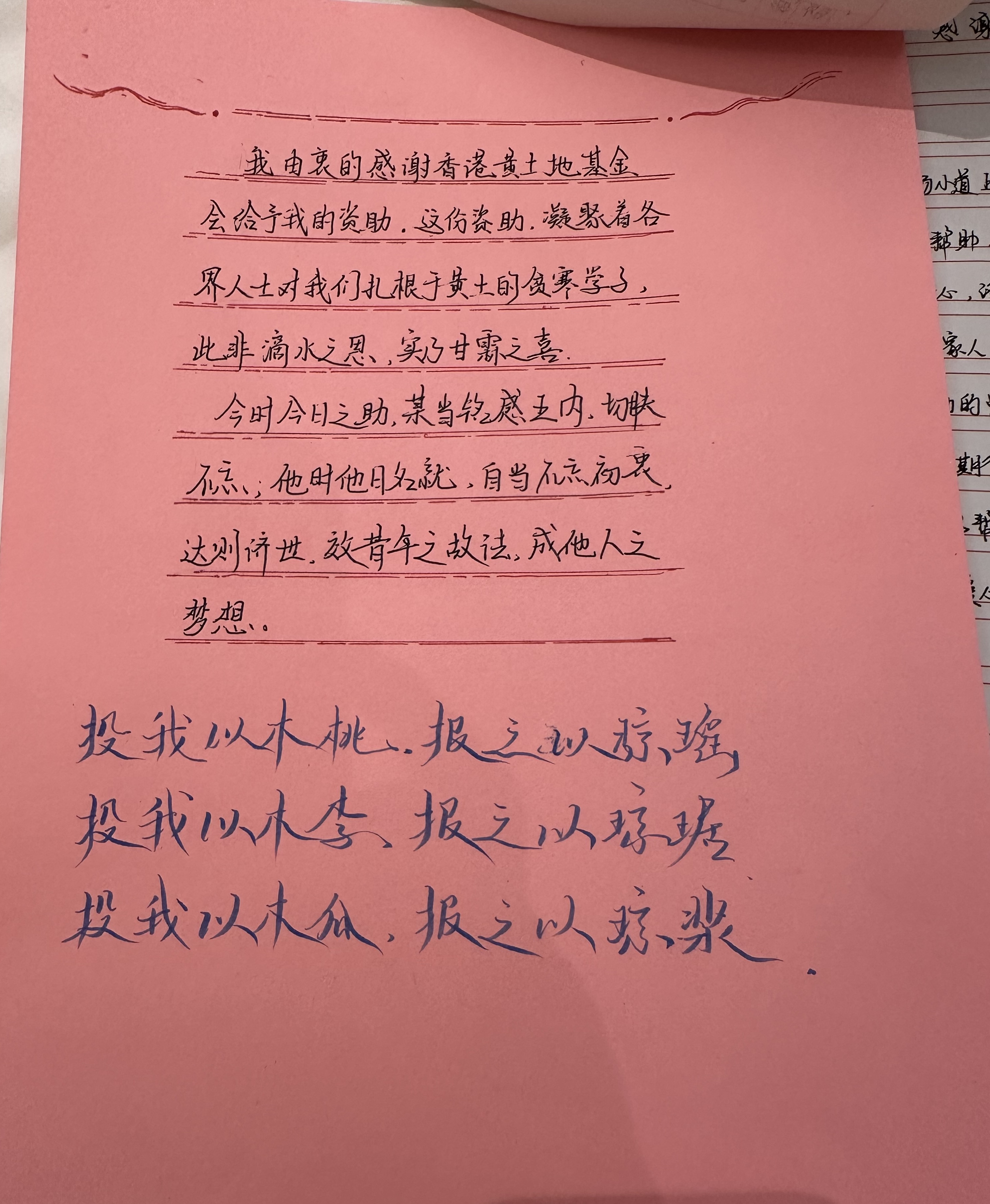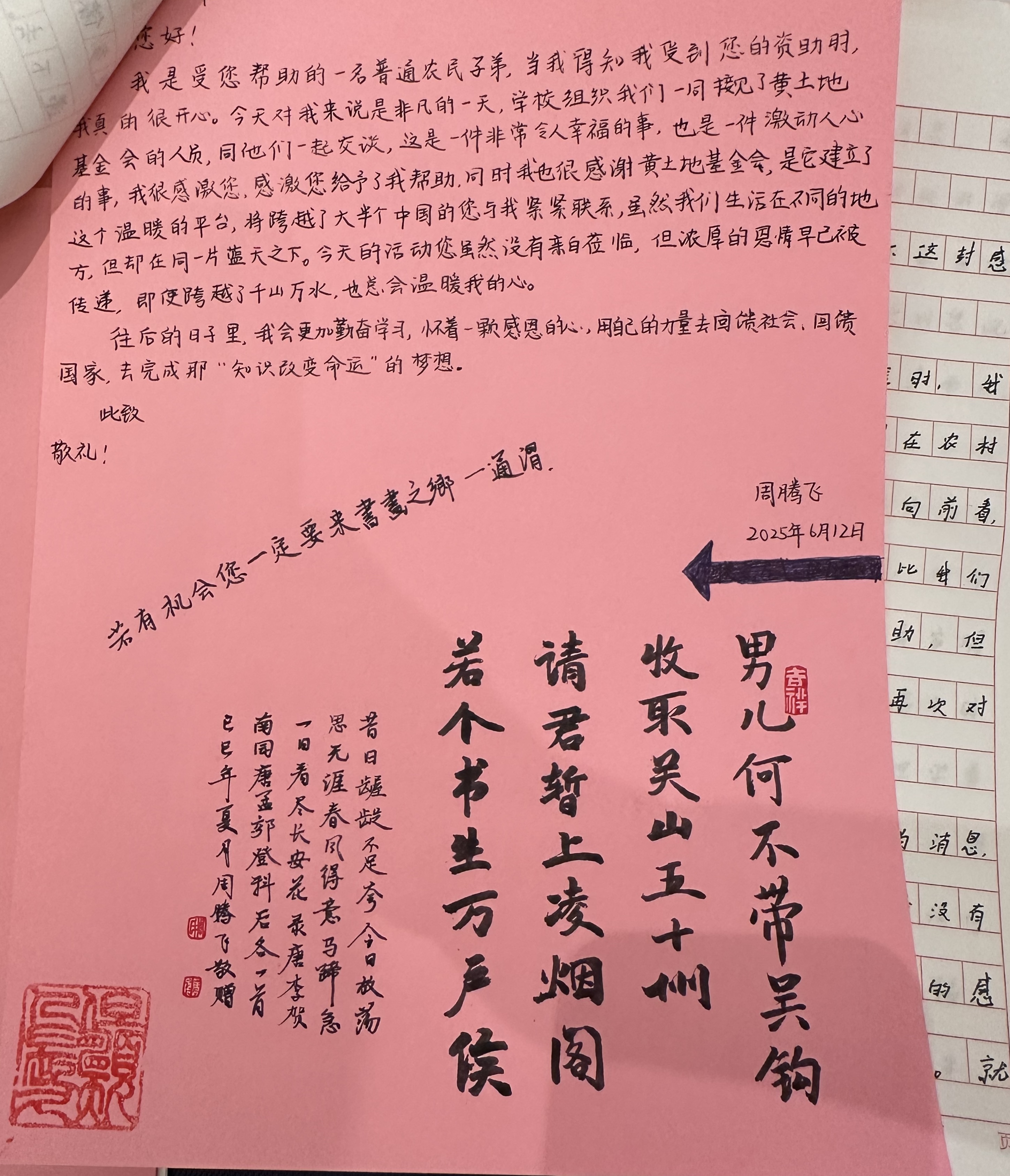 ← 隴西校友聚會 相片集 2025 慈愛實驗藝術職業學校 → 探訪通渭一中 探訪通渭一中 2025年6月12日,驅車兩個多小時從隴西縣來到通渭縣,探訪黃土地基金自本學年開始資助的通渭一中。接受資助的 90位品格良好、成績優異、家境困難的農民子弟都出席了座談會。 除了介紹黃土地基金,四位代表通過自己的故事,強調知識的重要,鼓勵學生發奮圖強,向著目標邁進。我們並向同學們傳遞黃土地基金精神:感恩、回饋,尤其是要做個好人,因為一個有能力但心術不正的人對社會的破壞更大!隨後,同學們即場書寫一段感想,讓我們帶回寄給各資助人。 ← 隴西校友聚會 相片集 2025 慈愛實驗藝術職業學校 → 2025-09-10T12:40:52+08:00 與他人分享這篇文章! FacebookTwitterLinkedInWhatsappEmail